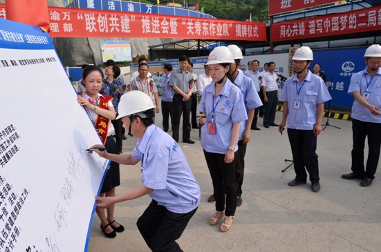 仪式上,鞠飞副主席为项目部授“创重庆市工人先锋号”旗帜,并与中铁二局集团公司工会主席张文杰为“关寿东劳模作业队”揭牌;出席仪式的领导还为各分部颁发了《职(民)工服务站》、《职(民)工夜校》牌匾,赠送了《职工服务手册》和体育用品;中铁二局渝万项目各分部领导班子签订了“联创共建”承诺书;“关寿东作业队”队长关寿东作了表态发言。
