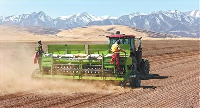 4月9日,搭载北斗导航系统的播种机在播种青稞。眼下,位于甘肃河西走廊祁连山脚下的山丹马场正值春播生产黄金期,随着气温回升,土壤化冻达标,田间地头农机轰鸣,农户们利用晴好天气有条不紊开展播种作业。