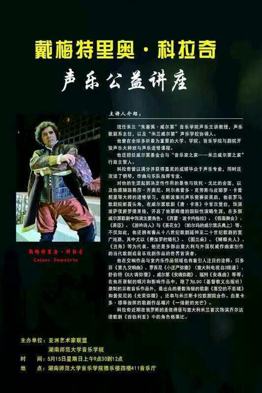 2016年邓桂萍教授又自掏腰包请意大利米兰威尔弟音乐学院声歌系主任国际知名男高音歌唱家戴梅特里奥·科拉奇到湖南师大音乐学院公益讲学,科拉奇曾在全球多所大学、音乐学院与剧院开设声乐大师班与声乐进修课。他曾以满分的优异成绩毕业于意大利梅西纳音乐学院声乐专业,同时他还攻读了钢琴、作曲与乐队指挥专业。曾跟随路易莎·齐奥尼、阿尔弗雷多·克劳斯与皮耶罗·卡普契里等大师进修学习。此次公益讲学活动让我国更多的艺术学子有了与世界音乐大师面对面学习的机会,也为湖南师大音乐学院与国际一流音乐学府搭起了友谊的桥梁。