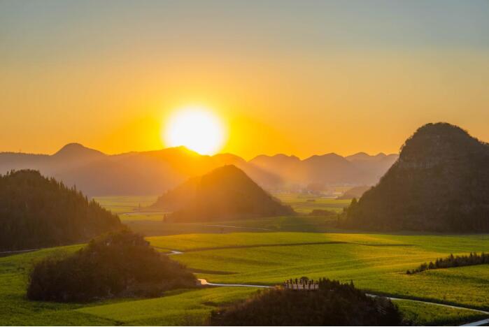 云南省罗平县金鸡峰丛油菜花海日出美景(新华社记者胡超2月19日摄,无人机照片)。