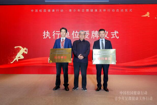 胡振民为中国关心下一代健康体育基金会青少年足踝健康专项基金(右一)、北京童足健步医学科技有限公司(左一)执行单位授牌。